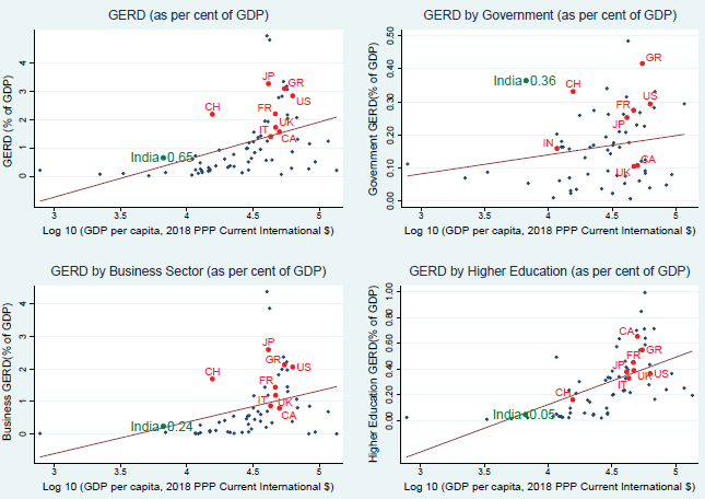 The lack of R&D investment has also been acknowledged, especially given the size of India’s economy and its level of development. A key reason for this is low gross domestic expenditure on R&D (GERD).