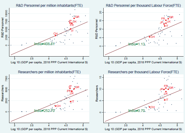 The Survey also indicates a poor performance with respect to capacity, with the levels of researchers and R&D personnel being low compared to India’s population.