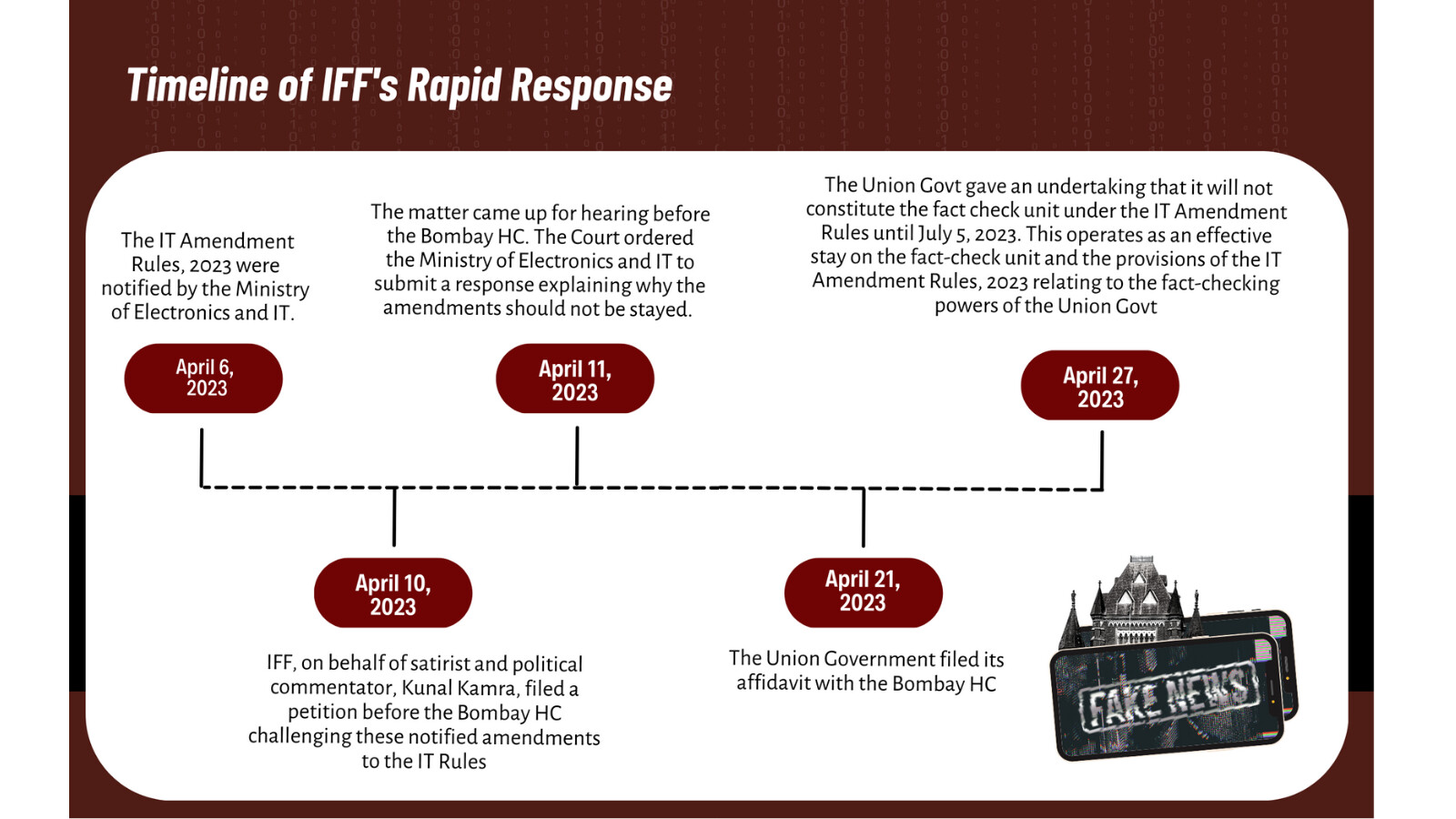 In April, the IFF team was hard at work, providing legal assistance to @kunalkamra88 in his challenge against the IT Amendment Rules, 2023 that create a government-appointed fact-check unit that can censor online content. https://twitter.com/internetfreedom/status/1651454137198936064?s=20
