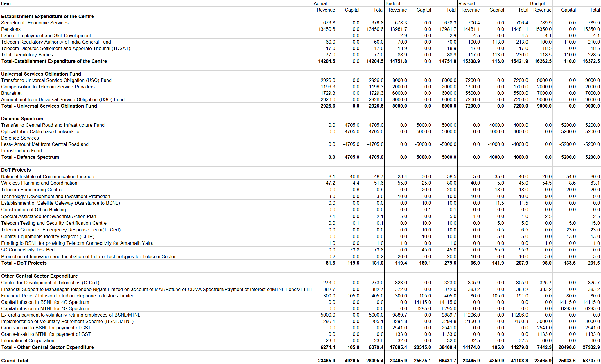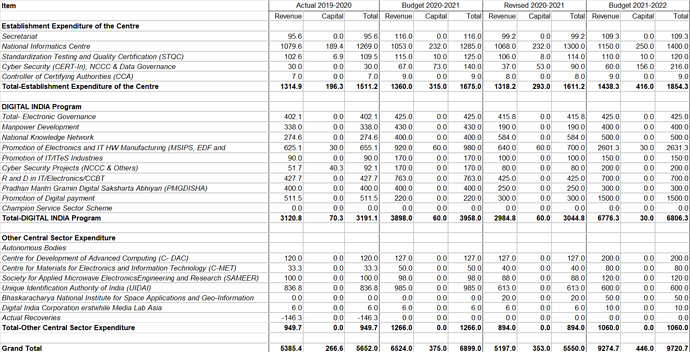 - A huge 460% increased in total capital expenditure over the Revised Estimates of 2020-21 can be observed, stemming largely from a 495% increase from the Department of Telecommunications. However, praise for these allotments be be tinged with hint of caution, as the Revised Estimates of 2020-21 for capital expenditure in the Department were only 17% of the Budget Estimates of 2020-21. While it is possible that the lower spending is due to the COVID-19 pandemic, the actual spend on capital expenditure in 2019-20 was also at similarly low levels (Rs. 5,1961.1 crore) .