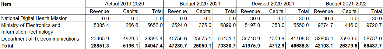 Budget 2021-22 has cumulatively allotted Rs. 68,487.7 crore to the National Digital Health Mission, the Ministry of Electronics and Information Technology, and the Department of Telecommunications: