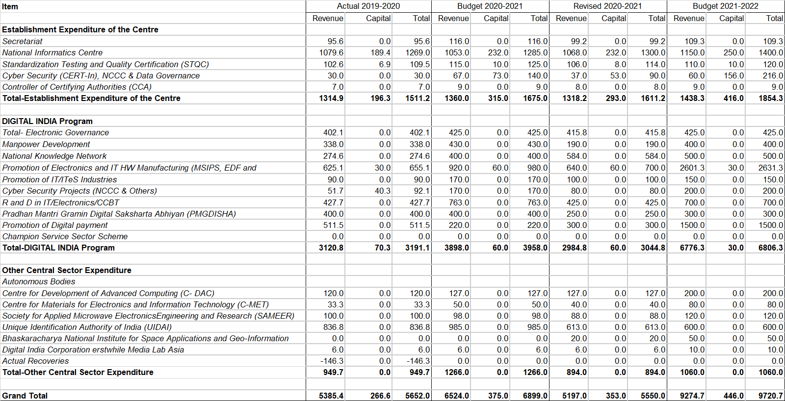 - For the Ministry of Electronics and Information Technology, this is a 75% increase over the Revised Estimates of 2020-21, which were a 2% decrease over the actual spending for 2019-20. The Revised Estimates were 19.6% less than the Budget Estimates in 2020-21.