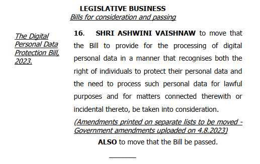 The Digital Personal Data Protection Bill, 2023 is listed for consideration and passing before the Lok Sabha on Monday, August 07.