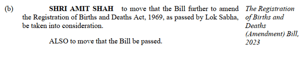 The Registration of Births and Deaths (Amendment) Bill, 2023 is listed for consideration and passing before the Rajya Sabha tomorrow (Monday) i.e. August 7, 2023. The bill has already been passed by the Lok Sabha on August 1, 2023.